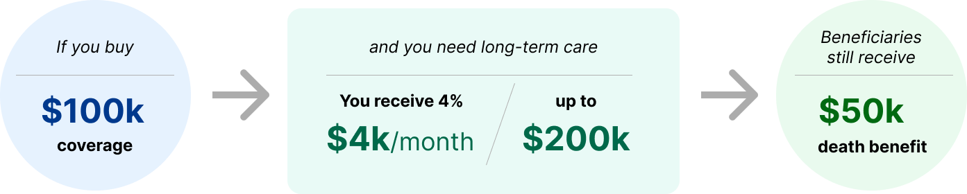 Your rate is based on the death benefit coverage amount, but you may receive up to double the original death benefit in long-term care coverage.